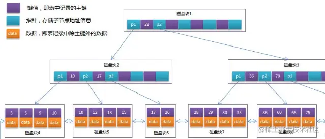 B-Tree结构图中可以看到每个节点中不仅包含数据的key值,还有data值。存储的数据量很大时同样会导致B-Tree的深度较大,增大查询时的磁盘I/O次数,进而影响查询效率。