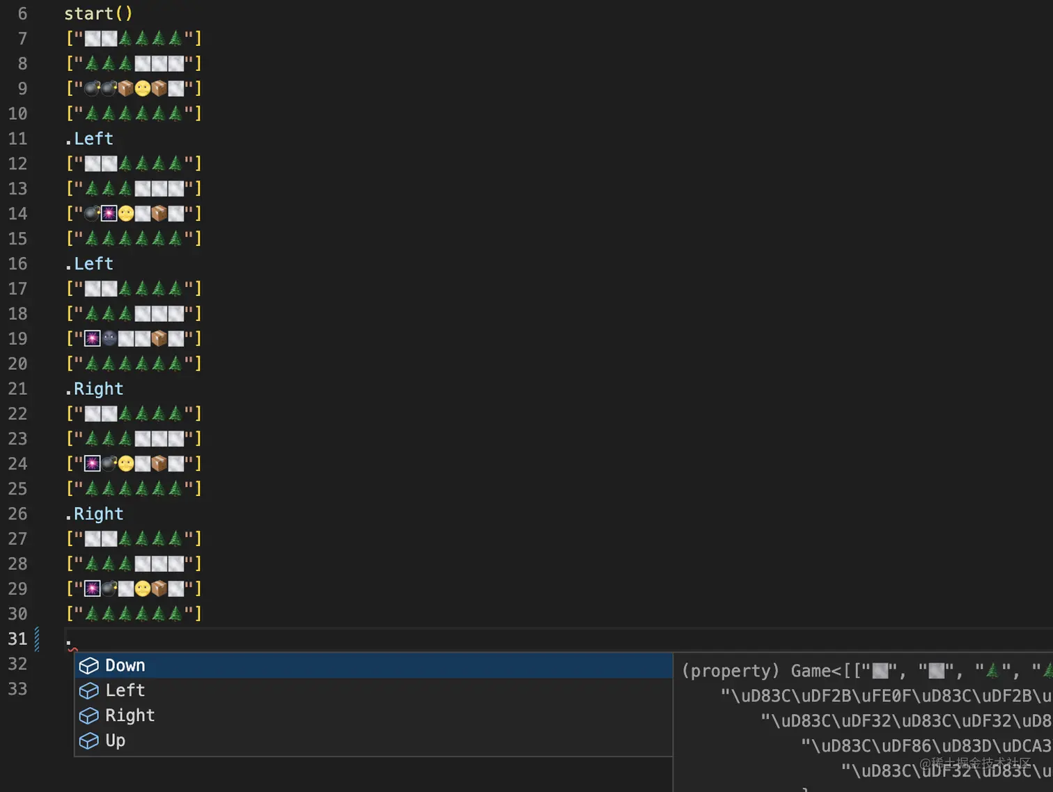 基于此特性,结合一些简单的类型编辑,即可通过代码提示,编写出一个简单可玩的推箱子游戏了~