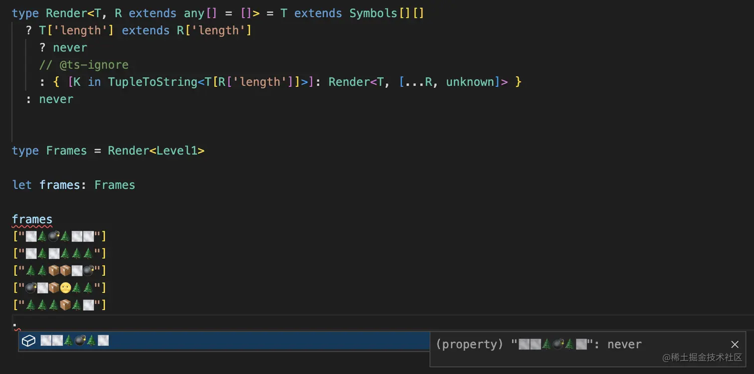 在使整个游戏地图重绘的 ProcessFrame 方法中,我们便利二维元组的每一行,通过 Player extends T[K][number] 和 PlayerOn extends T[K][number] 来判断当前行是否存在玩家,如果存在玩家则调用 ProcessLine 对当前行进行重绘,否则保持原样。