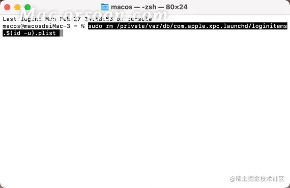 运行终端,输入命令:sudo rm /private/var/db/com.apple.xpc.launchd/loginitems.$(id -u).plist (注意命令最后的plist后面要加一个空格),示意图如下: