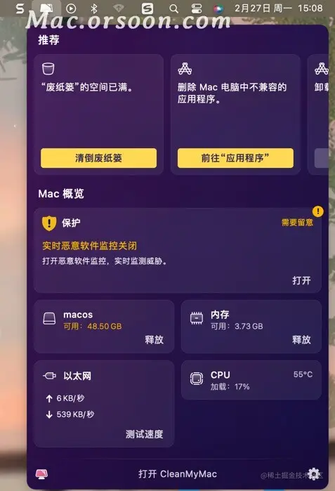 最后,重启你的Mac电脑,再打开CleanMyMac菜单,已经正常显示啦~