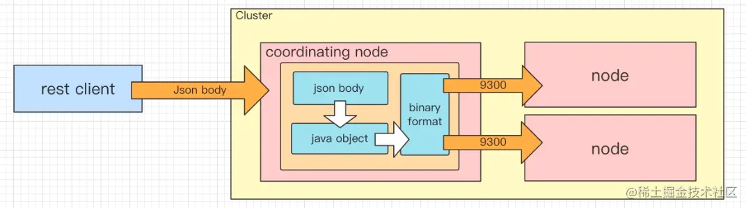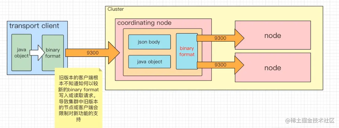 - Java Rest Client 在网络传输层使用的是 HTTPS 协议,传输的就是一串 Json body 数据,服务层接收到数据之后,需要把这个数据处理成 Java object,然后再转成 binary format,最后通过 transport 发送给 node,所以速度较慢,但不明显。