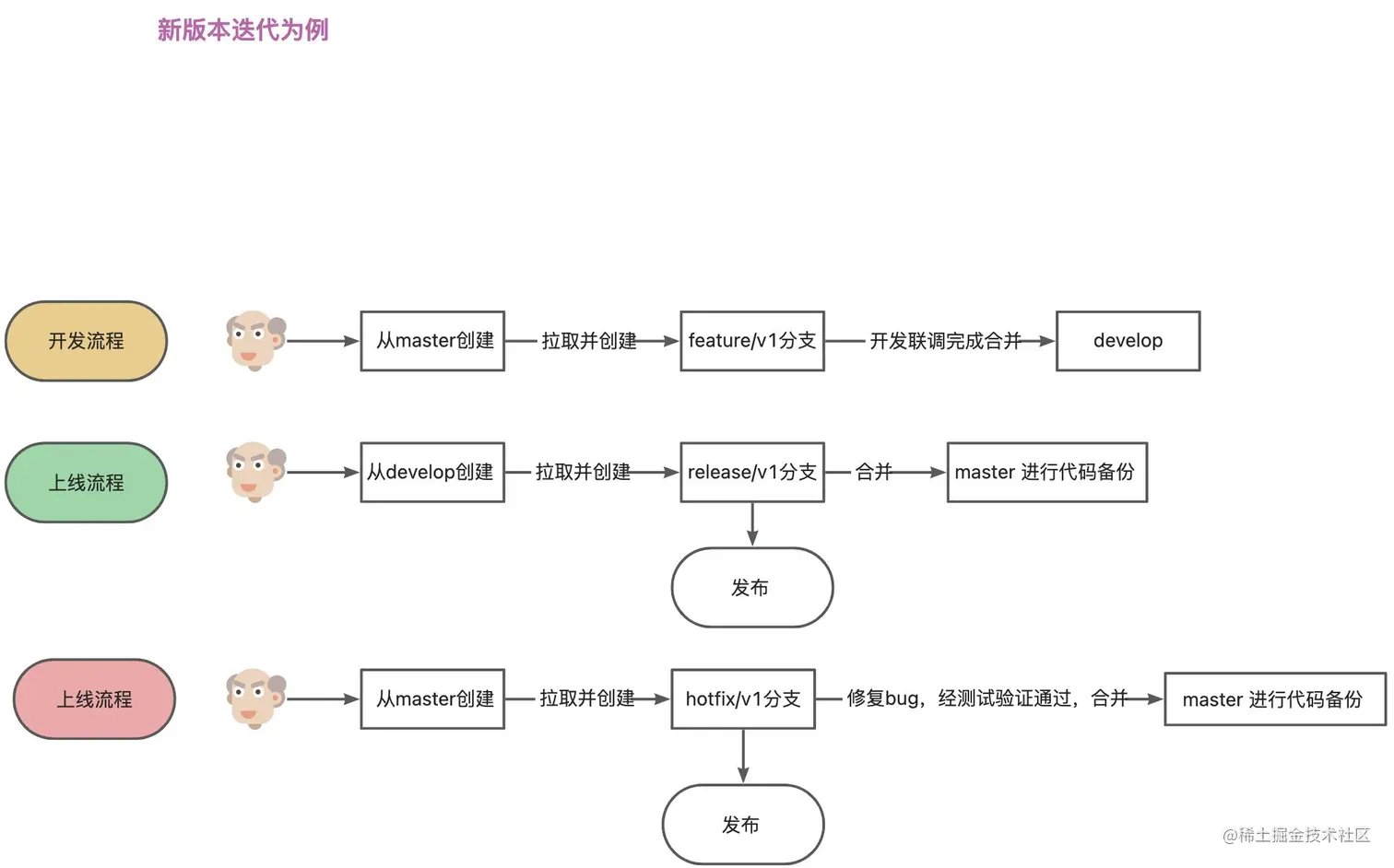 - release/* 发布分支 每次迭代发布都新创建 命令 release/+迭代版本命名 例如: release/v1