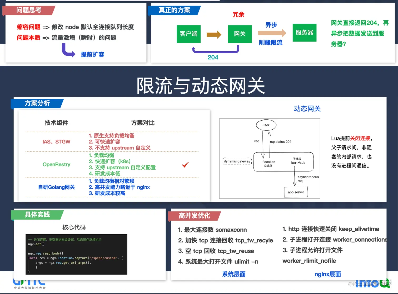 腾讯的李振老师,从多平台监控SDK、百万QPS上报的接入层和限流与网关这几个方面,给我们分享了他们的实践方案。目前腾讯的RUM(Real User Monitoring)支持的接入平台数量众多,通过单一平台单个sdk的方案,存在代码维护困难,协同成本高,发布版本不一致等问题。为了解决这些问题,他们采用了胖内核、异步插件、灵活配置插件组合的方案。中间经历过多次重构迭代,通过不断重构使设计模式和架构更趋于合理,提高SDK的拓展性和维护性。