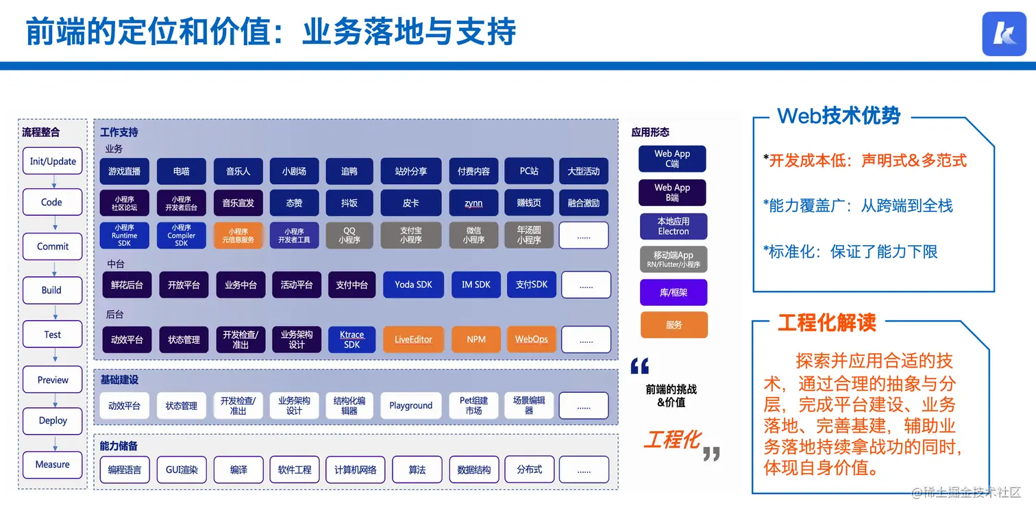 会议第一天继会议主编发言之后,就开始了由快手俞天翔大佬带来的《从“全干”工程师的发展路径看前端的定位与价值》。在分享中俞天翔老师表达了对前端定位和价值的观点。前端技术具有先天的优势,可以在不同的平台上运行,为前端同学提供了更多可能性,从跨端到全栈再到“全干”。从整个产品的开发交付流程上看,前端几乎在所有流程节点中都能有应用场景。包括各类前台业务支持:大型活动页面、直播、电商等业务,各类管理中台系统,各类提效后台系统和各场景上的基础建设。俞老师认为前端的挑战和价值的重点在工程化。如何理解工程化呢?探索并应用合适的技术,通过合理的抽象与分层,完成平台建设、业务落地、完善基建,辅助业务落地持续拿战功的同时,体现自身价值。
