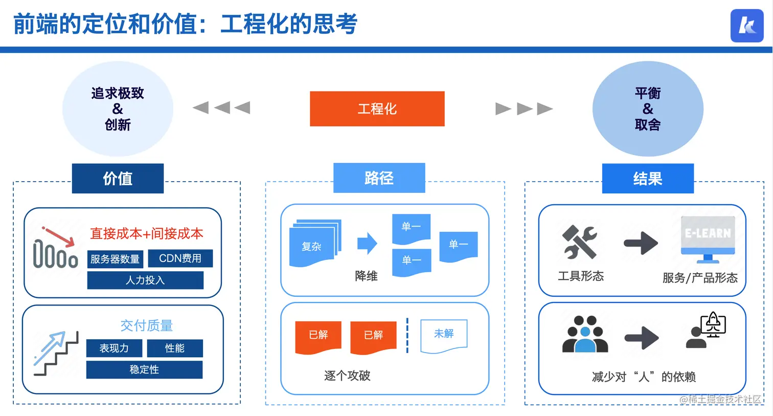 那在工程化上我们该如何实践呢?俞老师从价值、路径和结果,三个方面分析了对工程化的思考。首先在实现路径上我们需要对方案做简化降维,将复杂的问题拆解成单一的问题,然后再进行逐个击破。这样对于系统的可维护性和实现成本都有明显的优势。平常我们在做工程化项目的时候,往往目的都是为了保证开发流程的稳定、高效运行,不受限于某个开发同学或某项特定技术栈的支持。那么就需要将零散、复杂的提效工具整合成完善的服务或平台形态,减少‘人’在系统中的依赖,降低用户使用和理解成本,并且可以保障各项关键节点的溯源和权限管理。像这样完成项目后,在价值体现上我们可以从降本维度,包括直接成本和间接成本,如服务器数量、cdn费用、人力投入上去考虑。还可以通过交付质量层面,对业务系统的表现力、性能情况、稳定性提升等方面去考量工程化系统的价值所在。