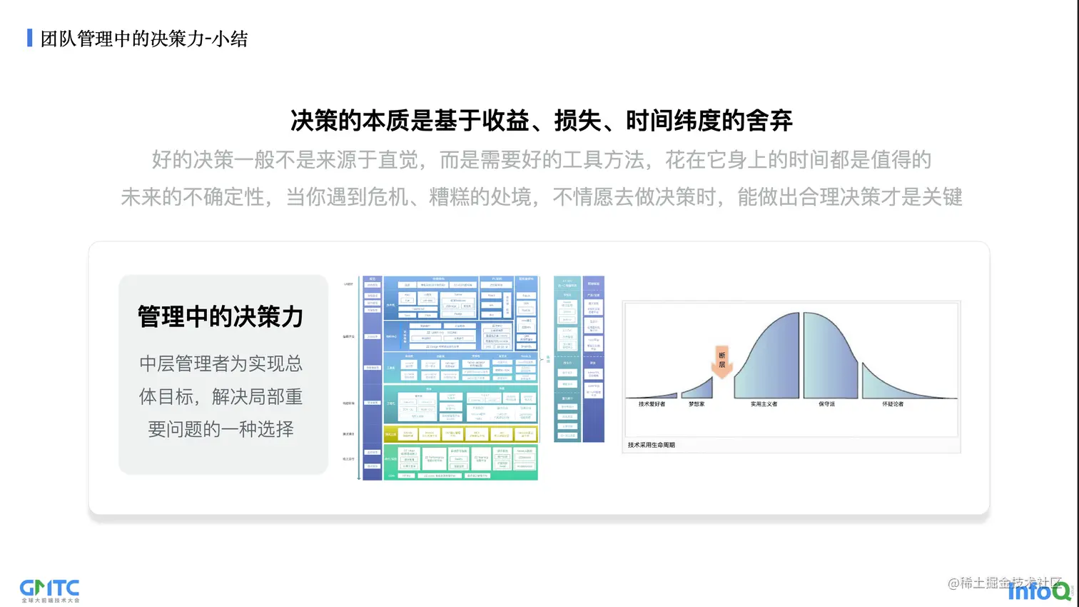第二位则是58集团前段技术委员会主席井铎铎老师 -- 《二手电商前端团队价值之路》。从前端团队价值、决策力,个人突破阐述了对团队管理的理解,并根据他的经验做了详细介绍。前端团队价值在于高效保证业务交付,创造更好的用户体验。决策力是管理者为实现总体目标,解决局部重要问题的一种选择。决策的本质是基于收益、损失、时间纬度的取舍。个人突破关键在于向上管理、升维思考、非正式网络构建和自我意识,最后让自己的工作进入心流状态。