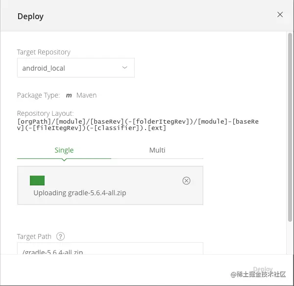 进入菜单 Artifacts 就可以看到刚刚创建的本地存储库了,点击右上角的 Deploy 可以上传本地包