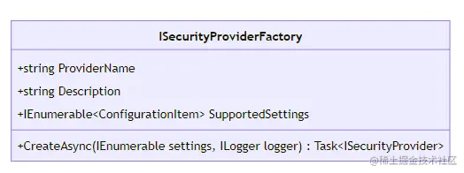 ISecurityProviderFactory 该工厂类的 CreateAsync 方法便是安全提供程序的初始化入口, 在这里可以将外部配置信息通过 ConfigurationItem 对象来注入安全提供程序中, 以便后续查询用户信息使用。
