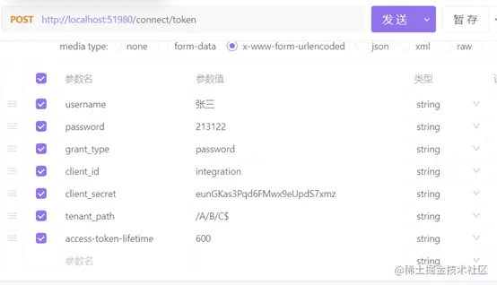 以上是 curl 和 javascript fetch/axios 调用获取token的方法, 接下来对参数内容加以说明: • username 用户名 必填 • password 密码 必填 • grant_type 定值 "password" 必填 • client_id 客户端id 访问 客户端管理 可查询 或 查询 帮助文档 必填 • client_secret 客户端私钥 访问 客户端管理 可查询 或 查询 帮助文档 必填 • tenant_path 组织机构角色参数,形如 /A2/C$3 表示 A部门1角色下的B部门2角色下的C部门3角色 选填 • access-token-lifetime token过期时间,单位秒 选填 这部分实际上只是第三方调用Wyn接口的场景,按场景1,场景2的内容开发完理应可以直接适应场景3的, 但需要有几个额外注意的点: