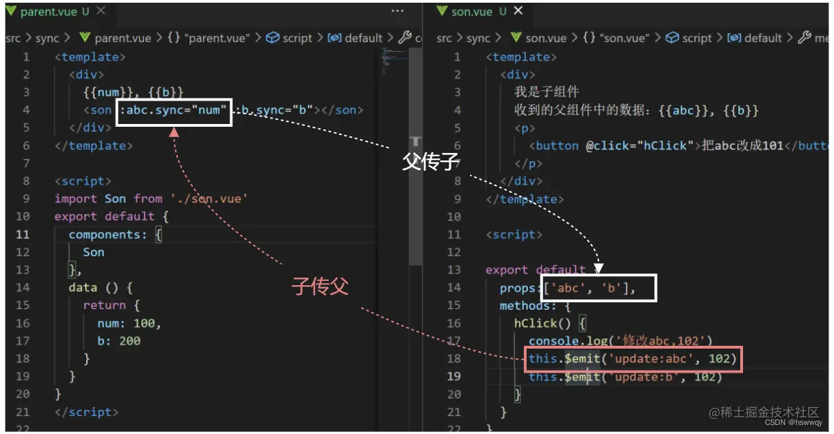 在vue2中我们可以使用.sync实现父子组件的双向绑定,效果就是父传子,子改变了,父组件就不需要@接收然后去手动改变了,就能直接双向绑定