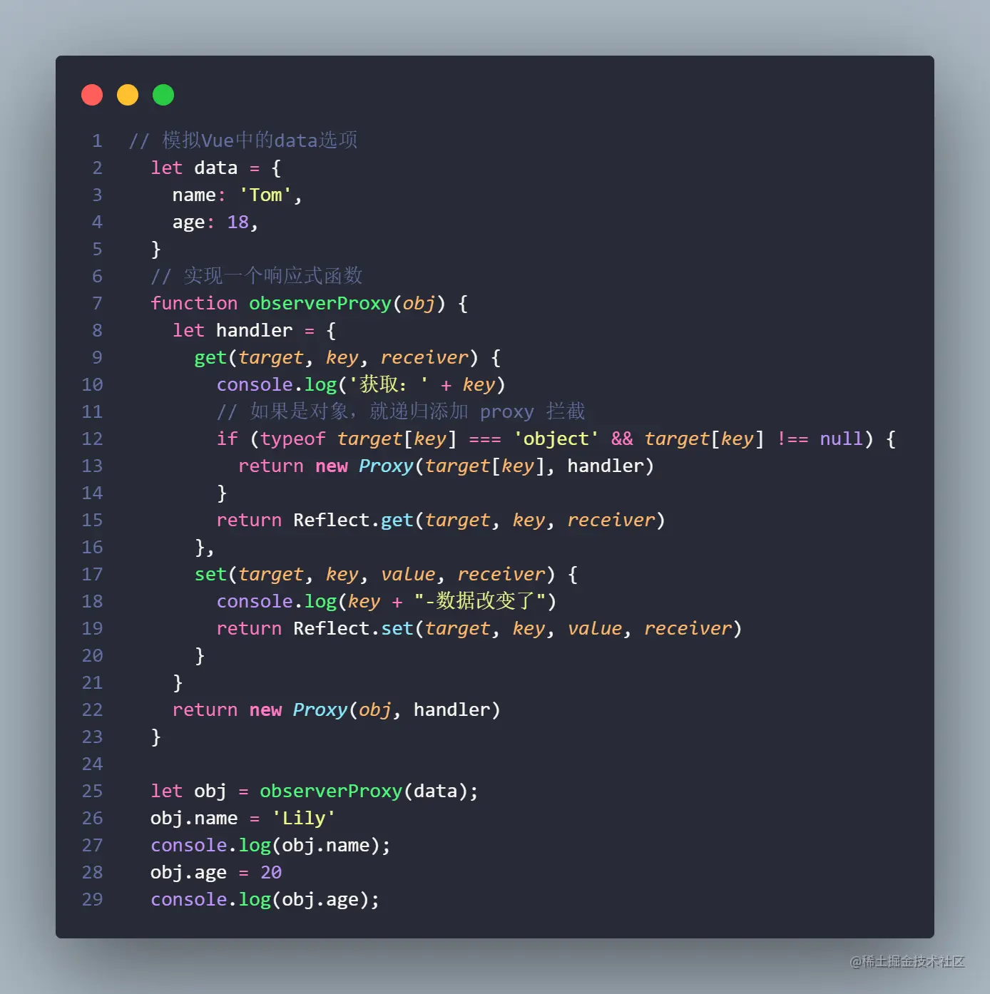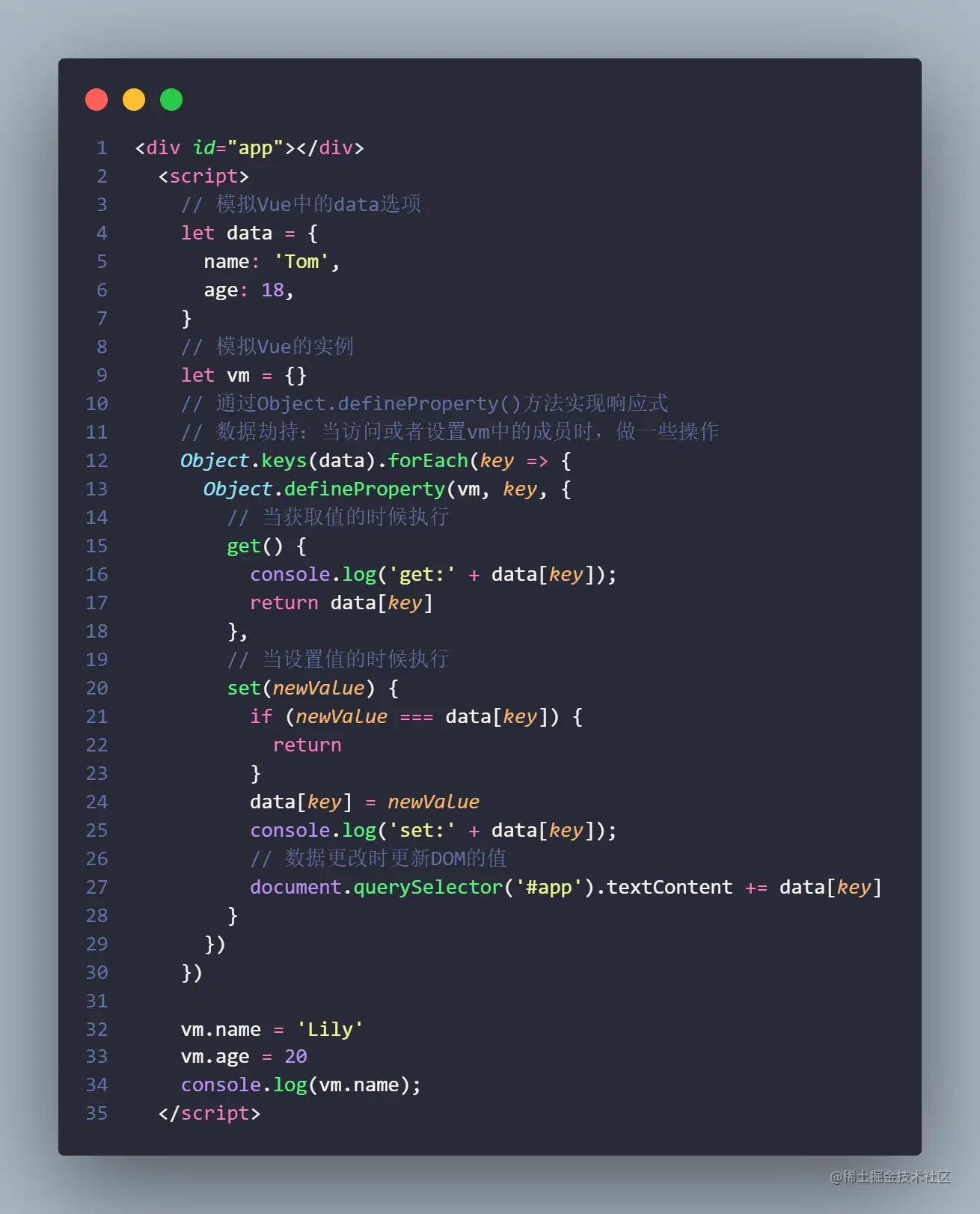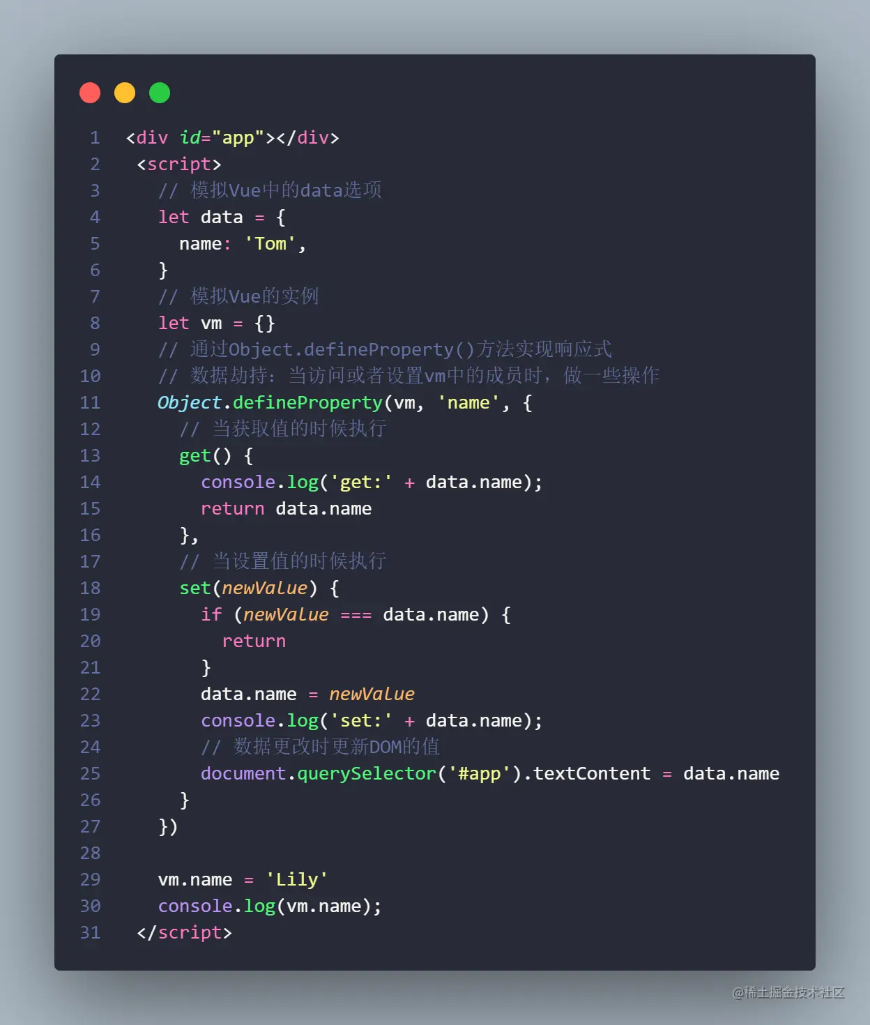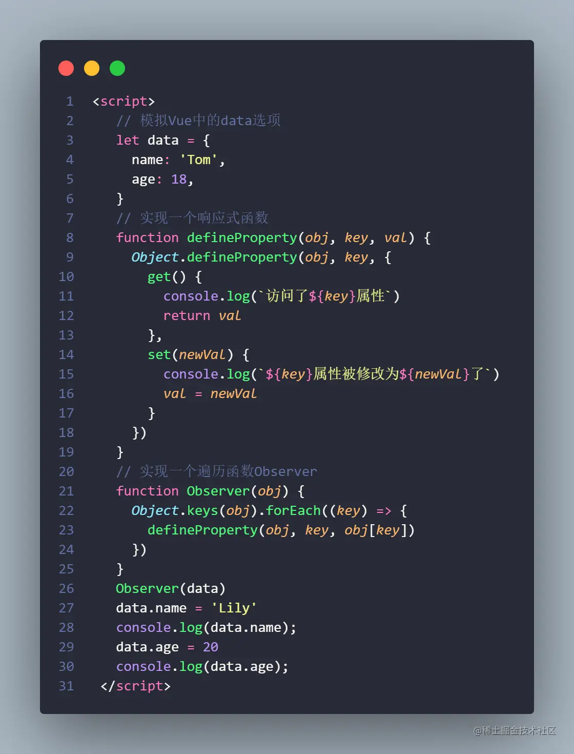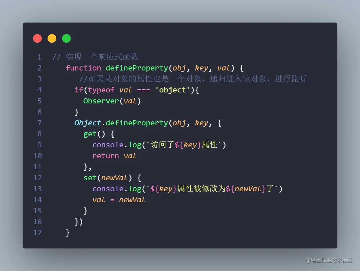 以上这些例子,用来说明Vue响应式的原理。Vue源码的实际操作,比这个稍微复杂亿点点。