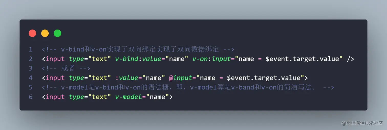 v-model 是 v-bind 和 v-on 的语法糖,也就是简洁写法。