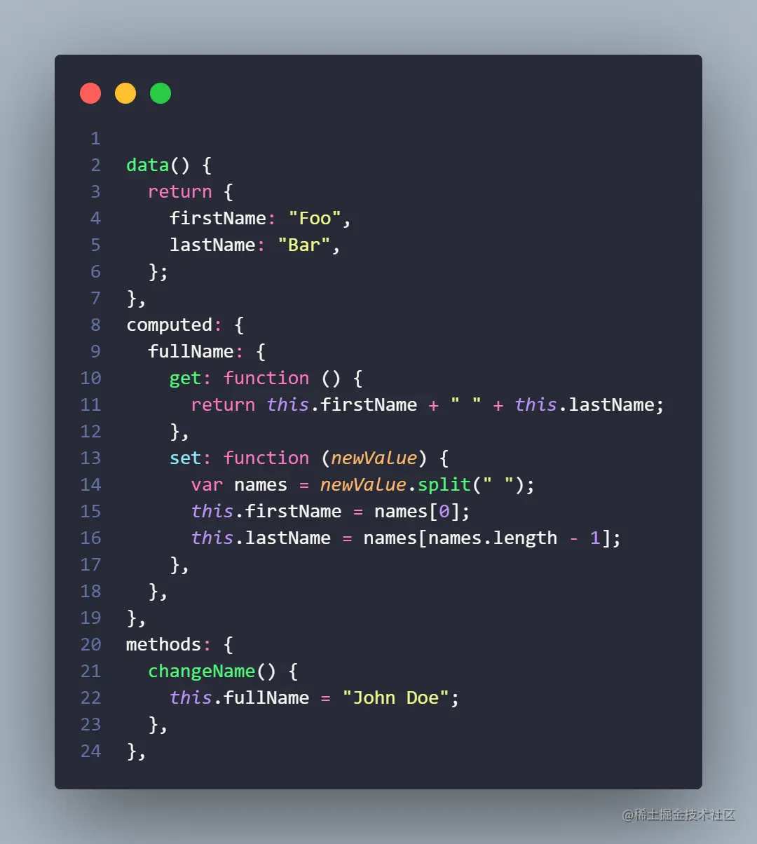 计算属性默认只有 getter,不过在需要时你也可以提供一个 setter