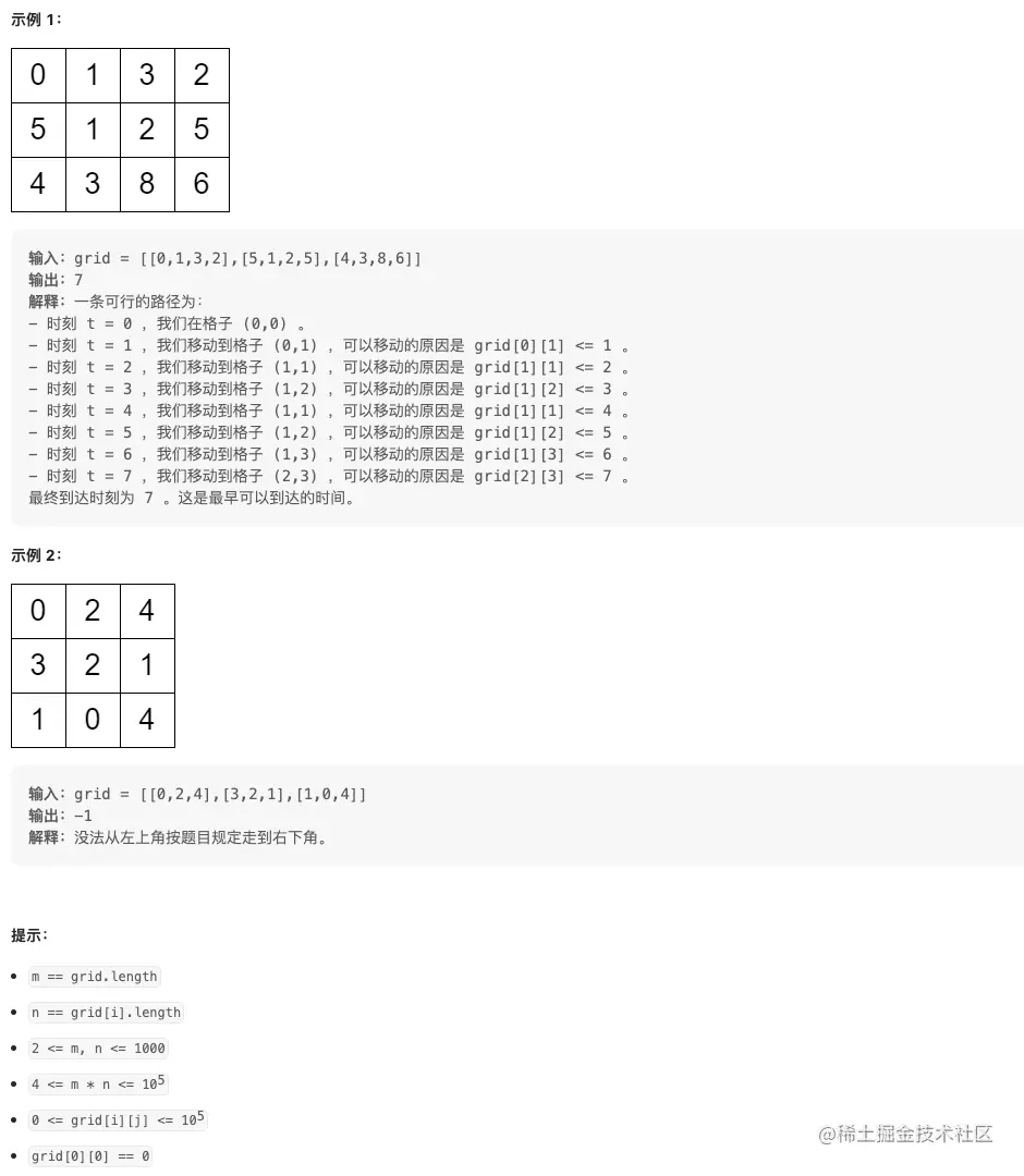 给你一个 m x n 的矩阵 grid ,每个元素都为 非负 整数,其中 grid[row][col] 表示可以访问格子 (row, col) 的 最早 时间。也就是说当你访问格子 (row, col) 时,最少已经经过的时间为 grid[row][col] 。