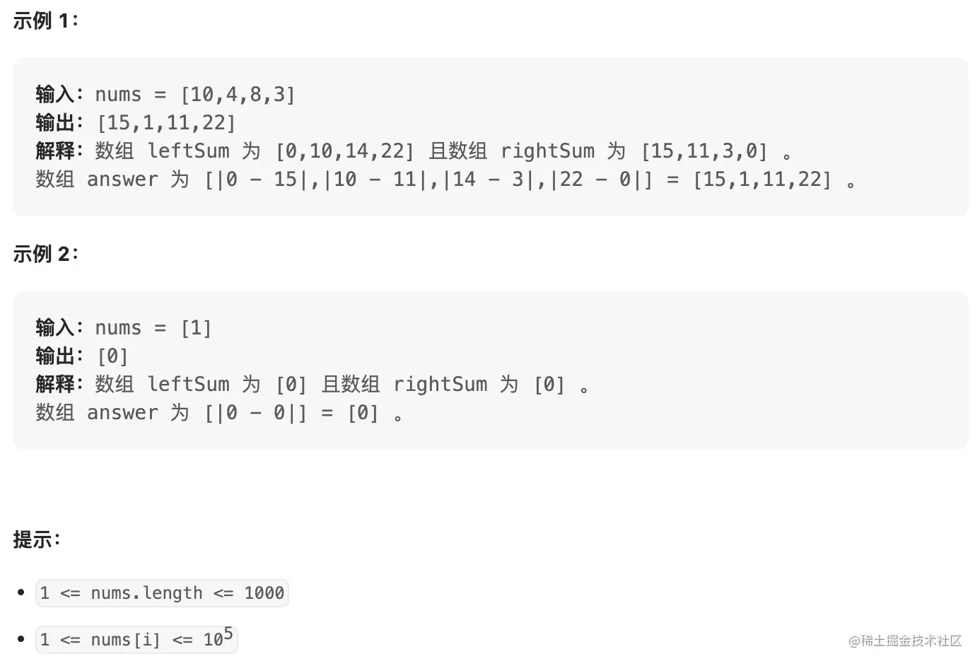 leftSum[i]是数组nums中下标i左侧元素之和。如果不存在对应的元素,leftSum[i] = 0。rightSum[i]是数组nums中下标i右侧元素之和。如果不存在对应的元素,rightSum[i] = 0。