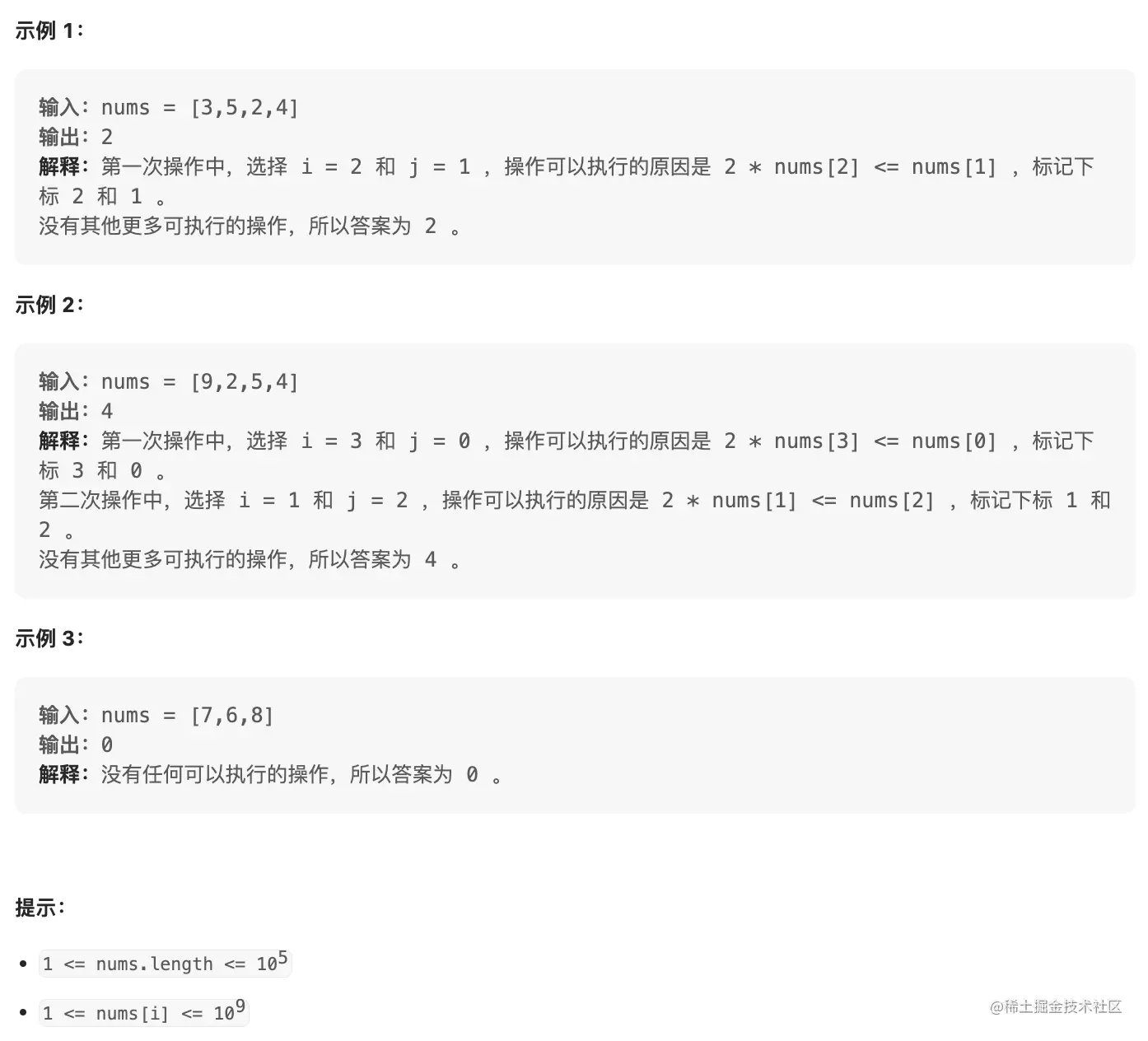 题目要求:选择两个互不相同且未标记的下标 i 和 j ,满足 2 * nums[i] <= nums[j] ,标记下标 i 和 j 。我们发现题目并不关心 [i] 和 [j] 的选择顺序,所以对排序不会影响问题结果,而且排序能够更方便地比较元素大小,因此题目的框架应该是往 排序 + [贪心 / 双指针 / 二分 / DP] 的思路思考。