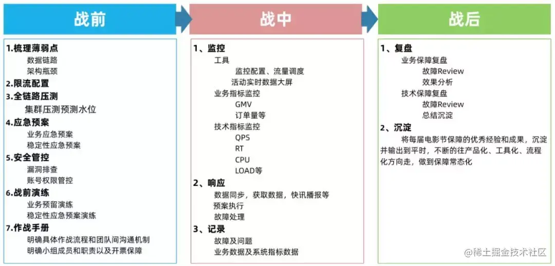 对于任何档期或者活动,系统的稳定性都是第一要素,针对电影节的活动场景,我们使用了很多设计上的稳定性模式,其中比较核心的有:多轮全链路压测、限流、降级、动态扩容、流量调度、减少单点、依赖简化等方式;除了以上几点,本节我们重点聊一聊我们在电影节过程中是如何保障备战的?