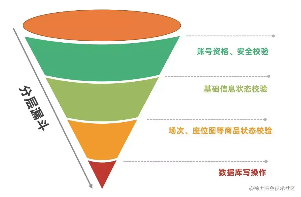 关键词是“分层削峰”,漏斗式的减少请求流量,在业务链路的过程中,我们会进行业务校验,层层过滤,如用户的账号安全、购买资格,影院、影厅等基础信息状态是否正常,要购买的商品信息状态是否正常、秒杀是否已经结束等,每个层次都尽可能的过滤掉非法的请求,只在最后端处理真正有效的请求,最终减少请求到数据库DB的写操作流量,保证系统处理真正有效的请求。