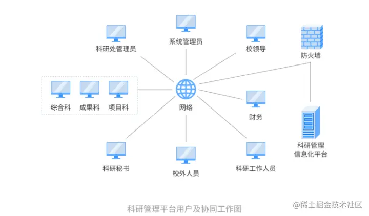 本系统是一个开放式的网络化管理系统。 由于其服务于全校范围内从事科研活动或者科研管理活动的科研工作人员,根据业务范畴的不同,其用户可以分为科研人员、科研秘书、科研管理人员、校领导、系统管理员等多种用户,并可根据需求自定义综合科、成果科、项目科等其他角色用户,各用户通过网络进行协同工作。