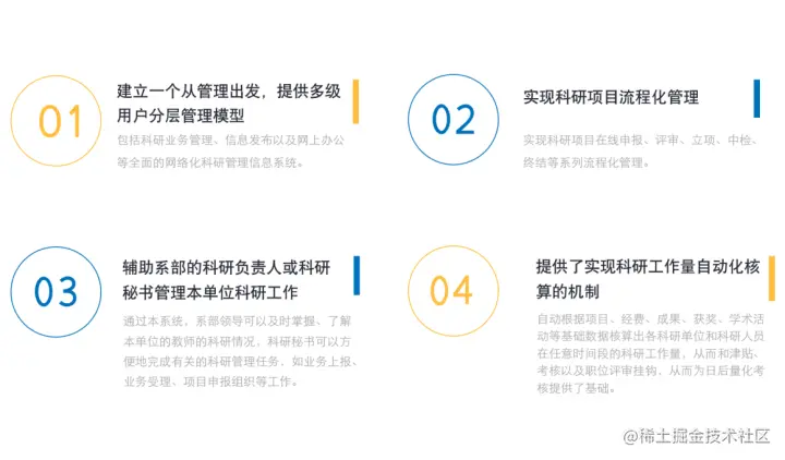 系统从结构上可以分为四个部分,即科研门户网站、核心业务流程、基础数据库和系统服务。 基础数据库是系统的基础,它包括机构、人员、项目、经费、成果、学术活动、获奖等信息。基于基础数据库上,结合科研的日常管理,系统提供了数据审核、项目流程管理、绩效考核以及年度统计等核心业务流程。 系统服务提供了用户、权限、参数设置以及安全方面的功能。