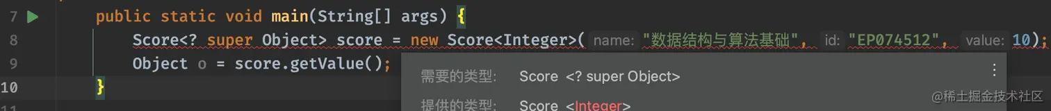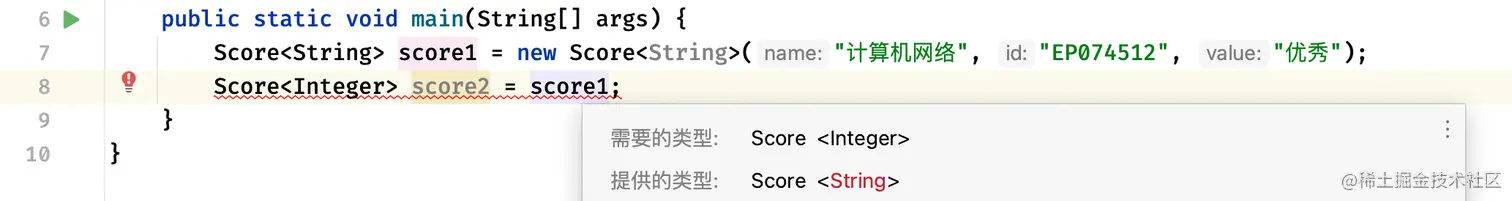 Score<String> score = new Score<String>("计算机网络", "EP074512", "优秀");