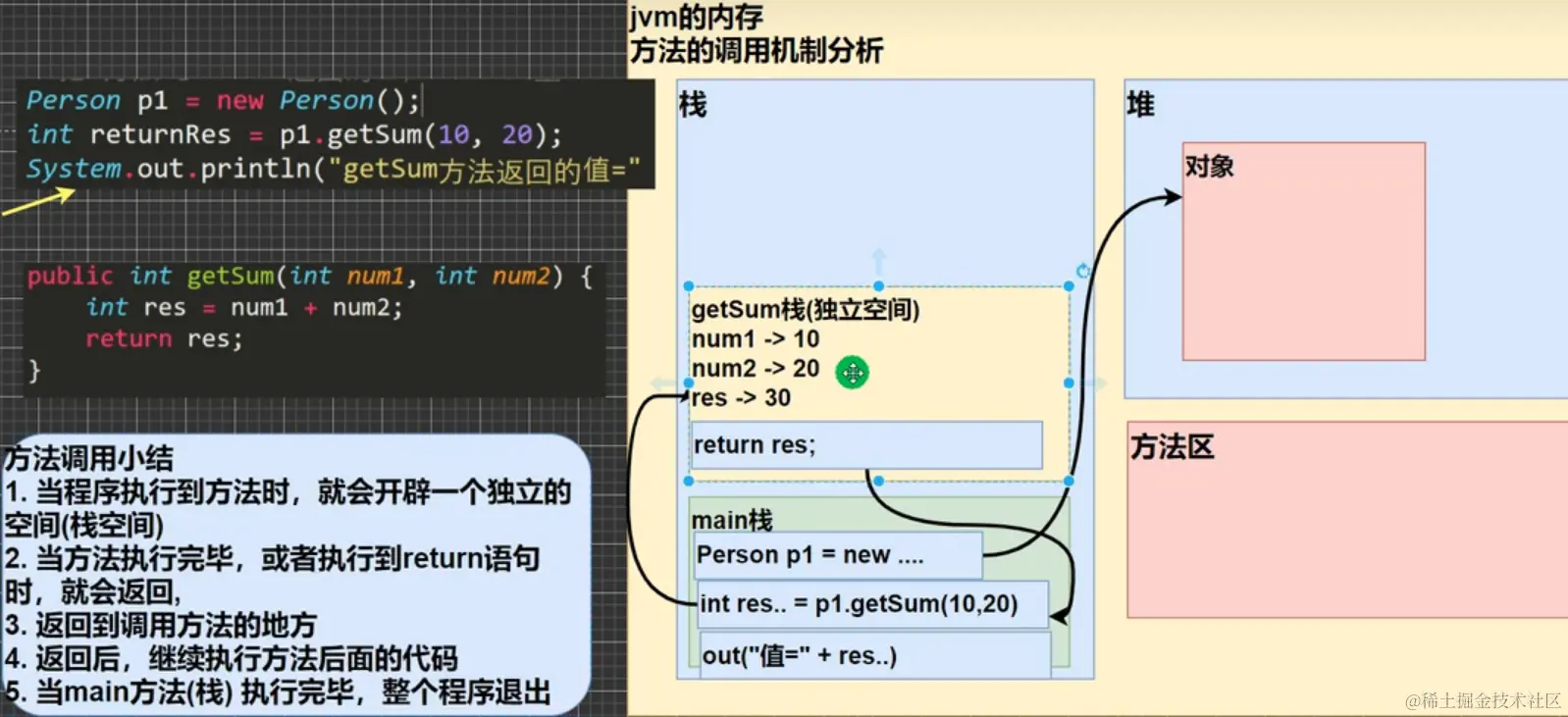 - 当一个方法执行完毕, 或遇到return, 就会返回, 遵守谁调用, 就把结果返回给谁~