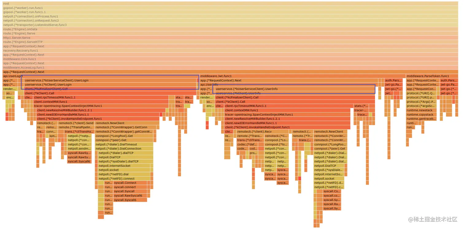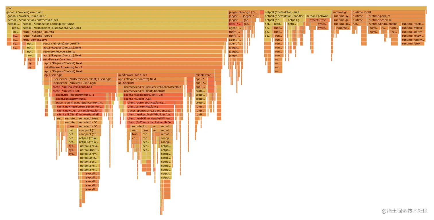 可以看到,大部分的 CPU 占用都在主要业务上,同时还有部分 CPU 占用在 jaeger 链路追踪。考虑到资源利用问题,可以在上线版本优化 jaeger 链路追踪。