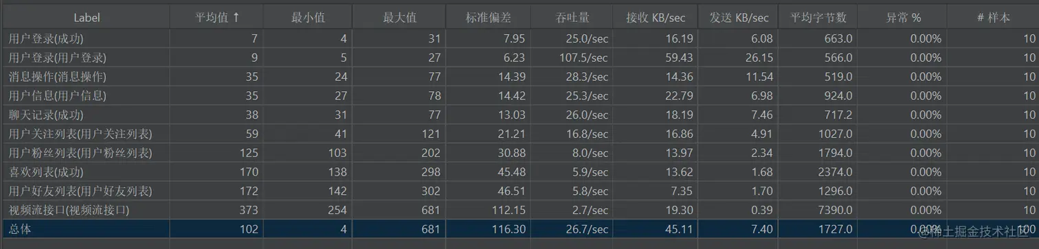 这里可以看到,当我们高并发发送信息时,可能会导致响应时间急速上升,并且出现异常量。