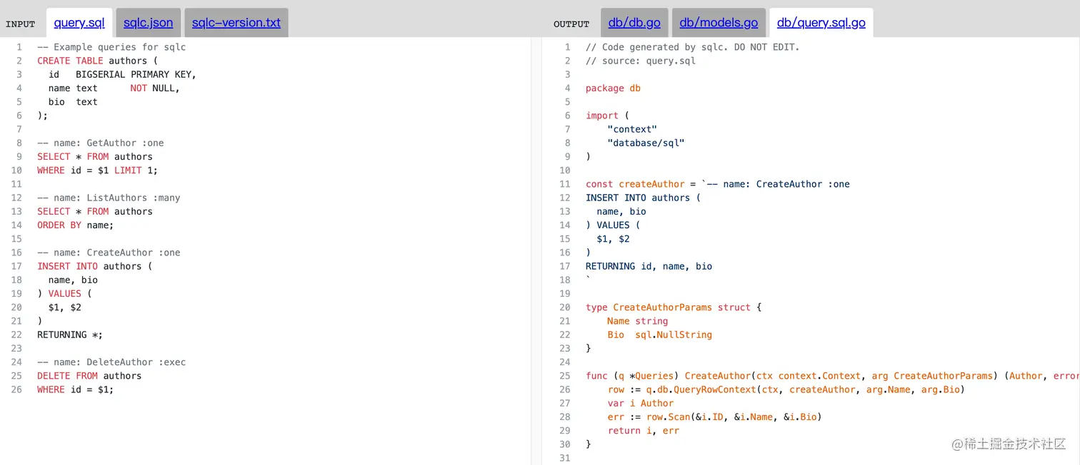 14、sqlc:将 SQL 转成类型安全的 Go 代码的工具。它可以将输入的 SQL 语句,自动转化成类型安全、可读的操作数据库的 Go 代码,支持 MySQL、PostgreSQL 和 SQLite 数据库。