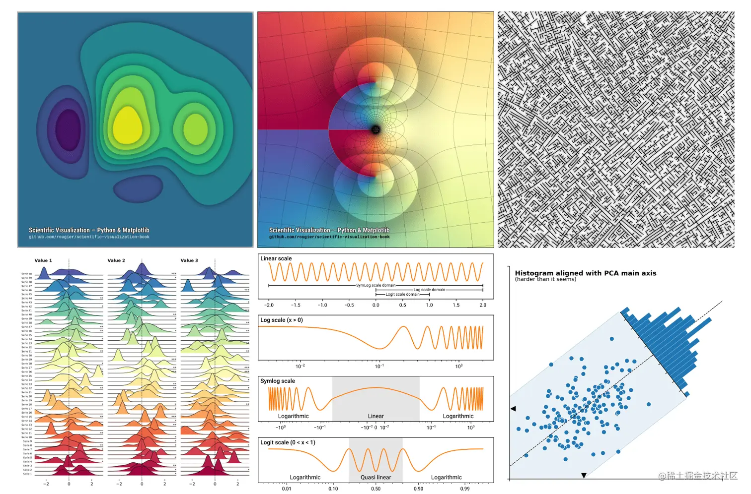 40、scientific-visualization-book:《科学可视化:Python+Matplotlib》。这是一本关于使用 Python 和 Matplotlib 进行科学可视化的开源书籍。该书分为四个部分:第一部分 Matplotlib 库的基本原理,第二部分致力于实战开发,第三部分是更高级的概念,即 3D 图形、优化和动画,第四部分是展示集合。