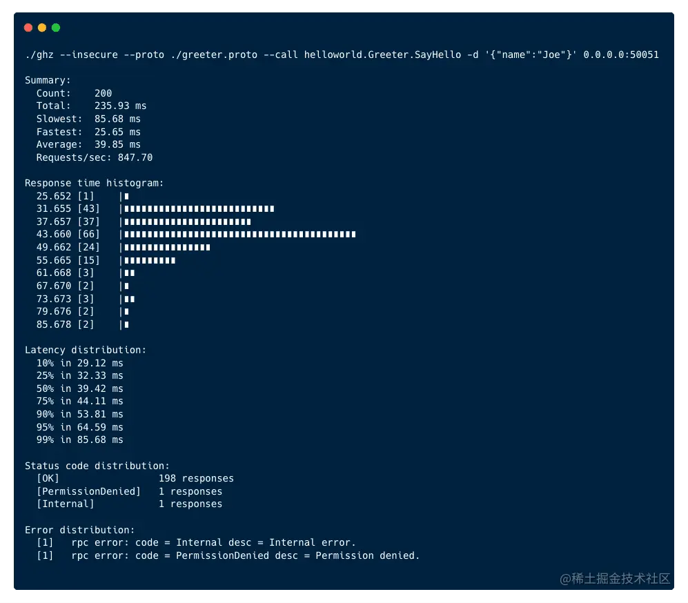 12、ghz:简单的 gRPC 压测工具。一款用 Go 开发的专门用来压测 gRPC 服务的命令行工具,它使用简单、高效、支持自定义参数。