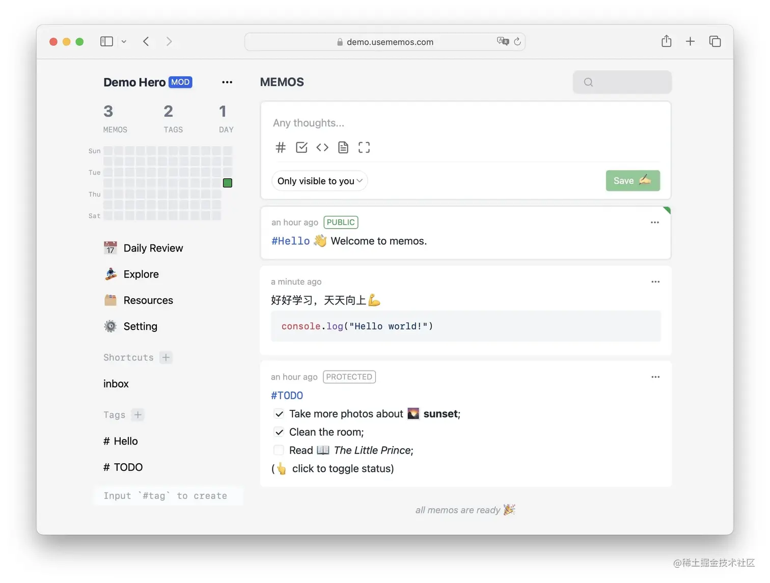 20、memos:一款清爽的轻量级备忘录中心。采用 React+Tailwind+TypeScript+Go 开发的备忘录中心,相当于极简的微博。支持私有/公开备忘录、标签、互动式日历等功能,以及 Docker 部署。