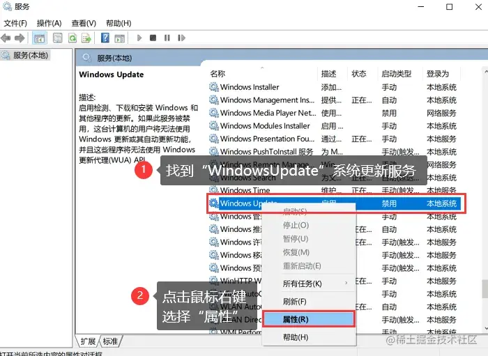步骤2: 右键【Windows Update】服务,进入【属性】窗口;