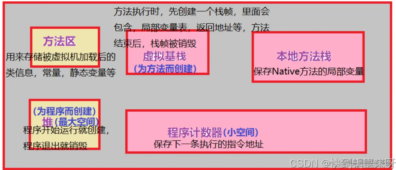 - 栈: 放的是方法之间的调用关系 (虚拟机栈: java 里面用来保存调用关系的内存空间; 本地方法栈: 本地方法,也就是 JVM 内部 C++ 写的代码,调用关系的内存空间)