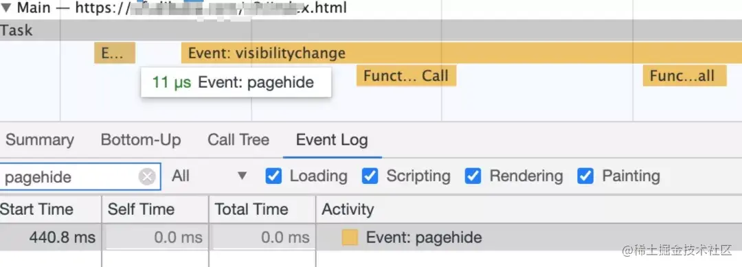 从下图中可以注意到,为什么事件的触发顺序和上面的生命周期流程图不一致,是 pagehide -> visibilitychange -> unload 呢?事实上,在浏览器之前的设计中,如果页面在卸载阶段可视,visibilitychange 就会在 pagehide 之后触发,正如下图截图中一样。这就使得页面的卸载在不同可视情况下,有着不一致的生命周期与事件顺序,给开发者带来复杂性。
