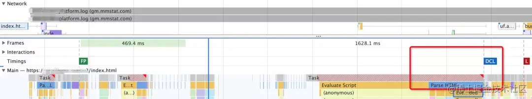 DOMContentLoaded 表示 HTML 已经完全被加载和解析,当然样式表、图片等资源还不一定已经完成加载。从下图中可以看到,经过多段 HTML 解析后,DCL 之后就没有其他的 Parse HTML 了。