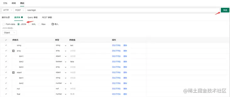 API Path 里面可能填写了 Query 参数,Eoapi 会将它自动同步到 Query 参数的表格里面。首先确认你的 HTTP 请求体格式,选择相应的请求体格式后点击测试按钮。