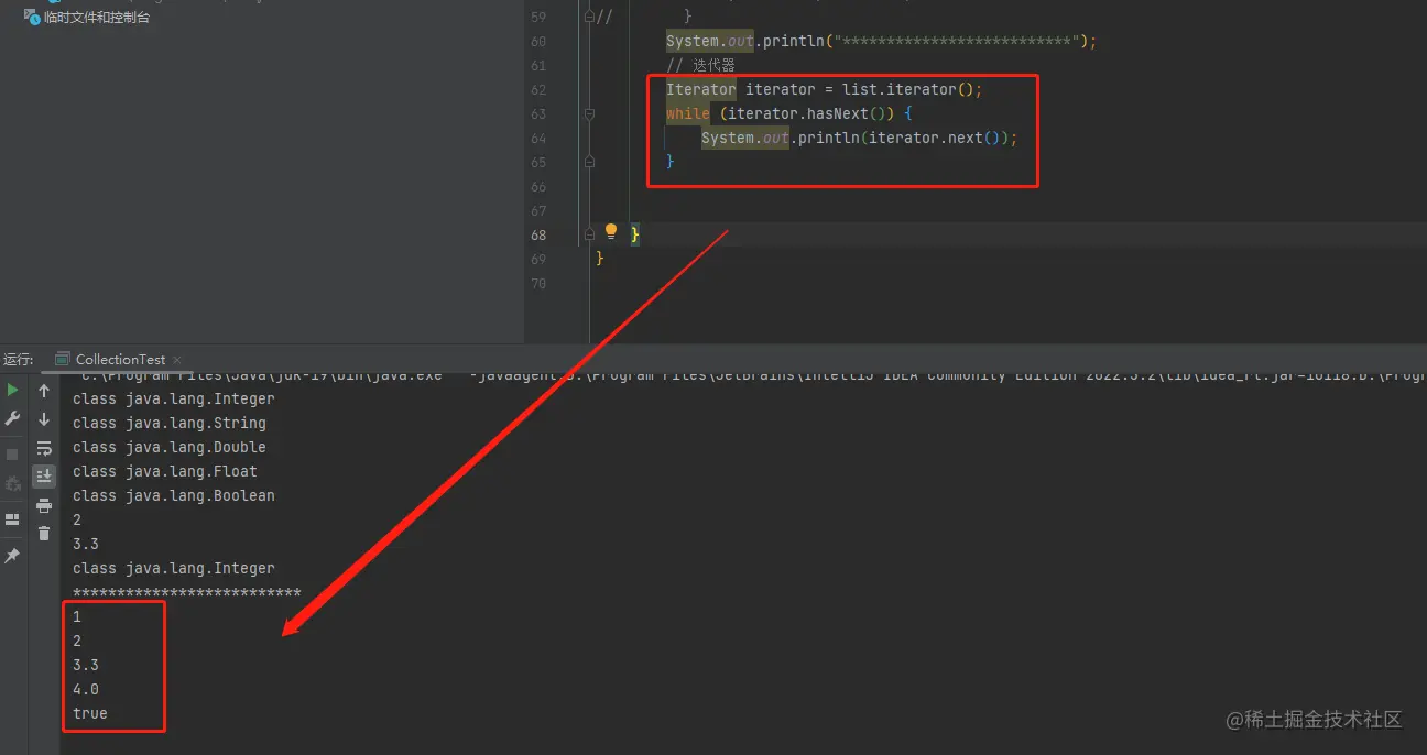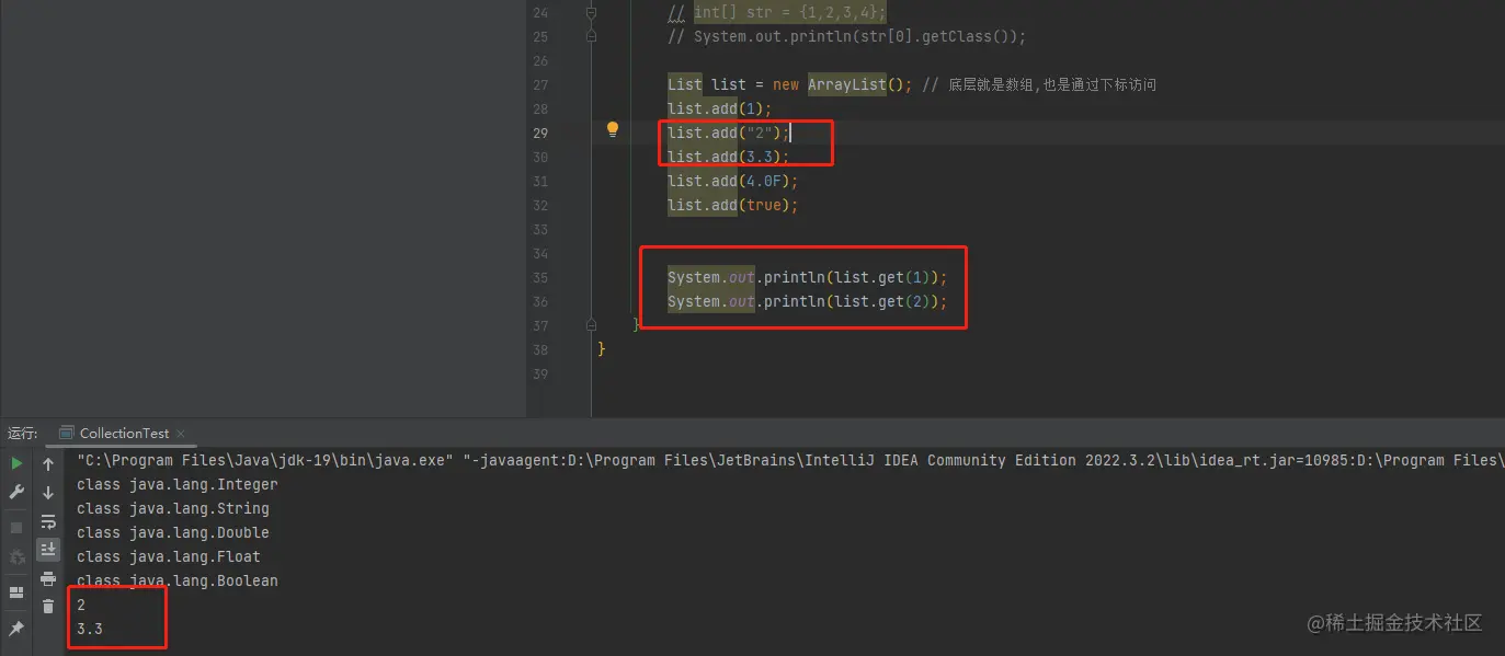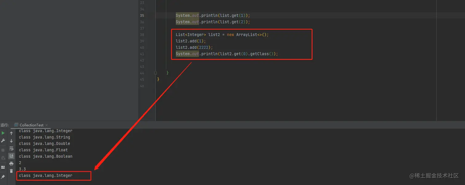 【1】新增一个类,用来测试集合。先创建一组数组,数组可以存放不同的数据类型。对于Object类型的数组元素,可以通过.getClass方法获取到具体类型。