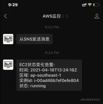 接下来我们就启动一台EC2实例,在微信端就可以看到相关的告警信息了: