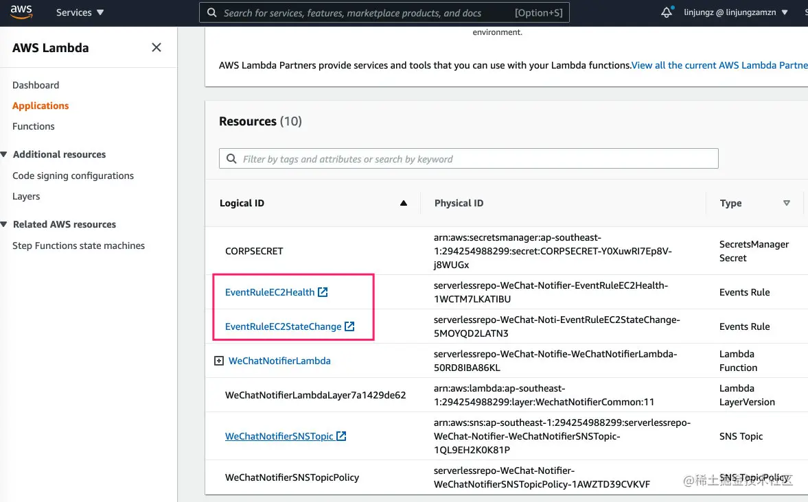 如前面所述,这个应用部署了两个示例的规则,分别是捕获AWS健康事件和EC2状态变更事件,同样可以在 Lambda 控制台中找到这两个规则: