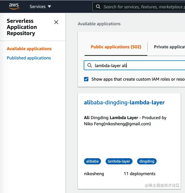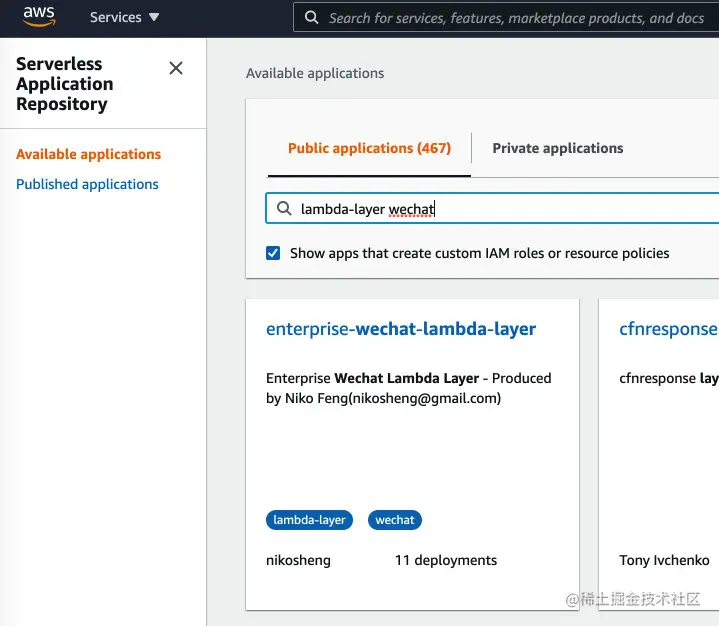这个Serverless应用提供一个无须编写代码便可快速部署微信告警通知的功能。你可以在AWS控制台进到 Serverless Application Repository(SAR)这个服务(有点像AppStore,只是这个应用商店是专门放基于Serverless应用的,AWS的用户都可以在上面提交),然后搜索 wechat,就可以找到这个应用 WeChat-Notifier: