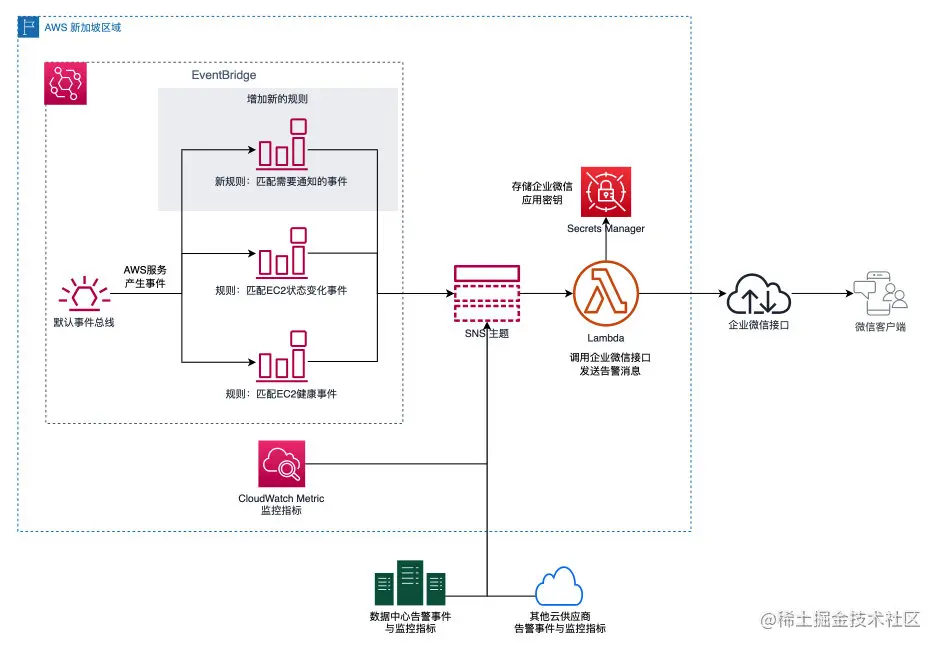 通过EventBridge可以方便地增加Rule,以便捕获所关心的事件类型,并将相关告警消息发送至微信。同时,其他的AWS服务,如CloudWatch等也可以将告警信息发送至SNS,甚至本地数据中心或其他云上,也可以利用SNS来进行微信消息的推送。相关架构图如下所示: