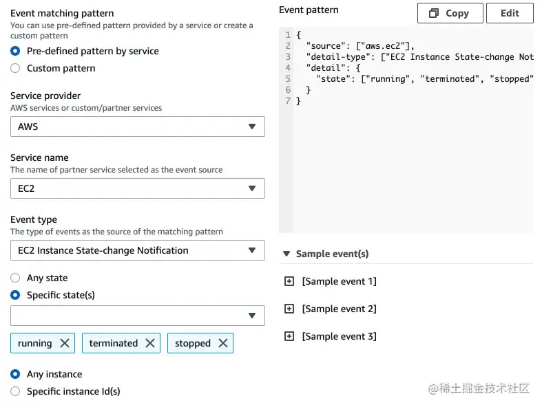 接下来以EC2状态变更事件为例来看一下EventBridge规则的编写。在EventBridge的控制台上我们可以看到 Event Pattern 是