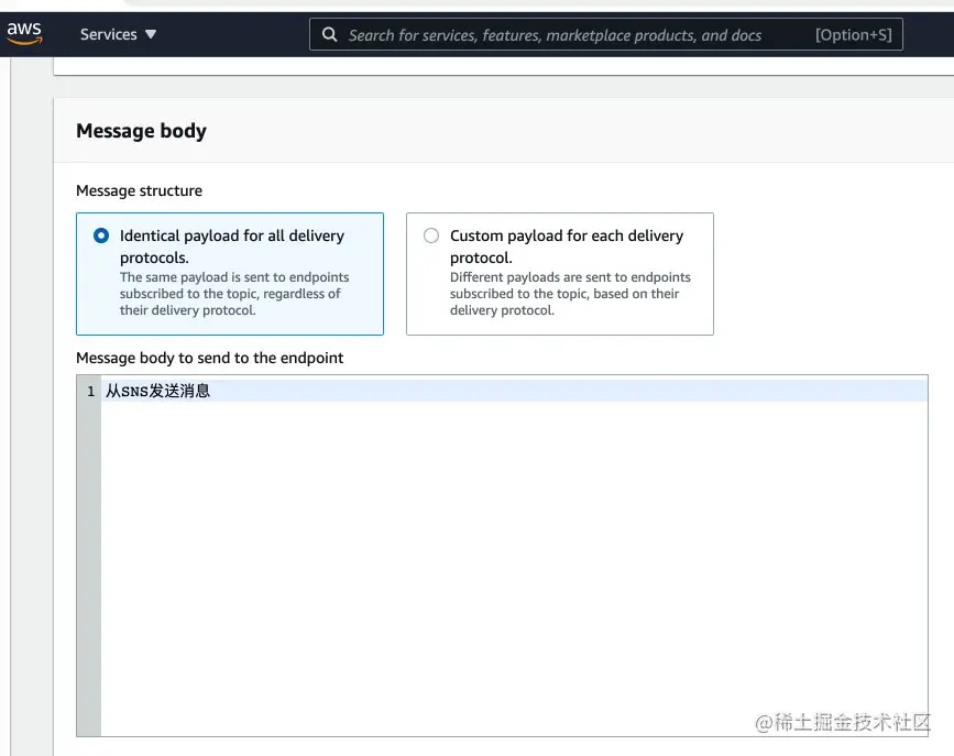 接着在 SNS 控制台里直接进行消息发送,在Message Body里填入要发送的消息即可