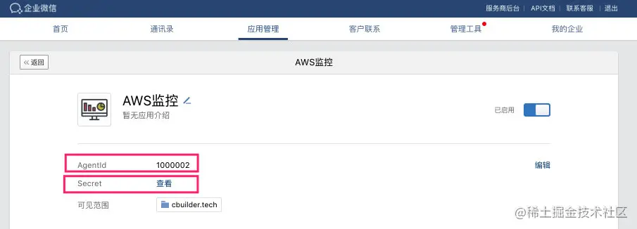 首先登录企业微信管理后台,创建一个新的应用,并记录 AgentId 和 Secret