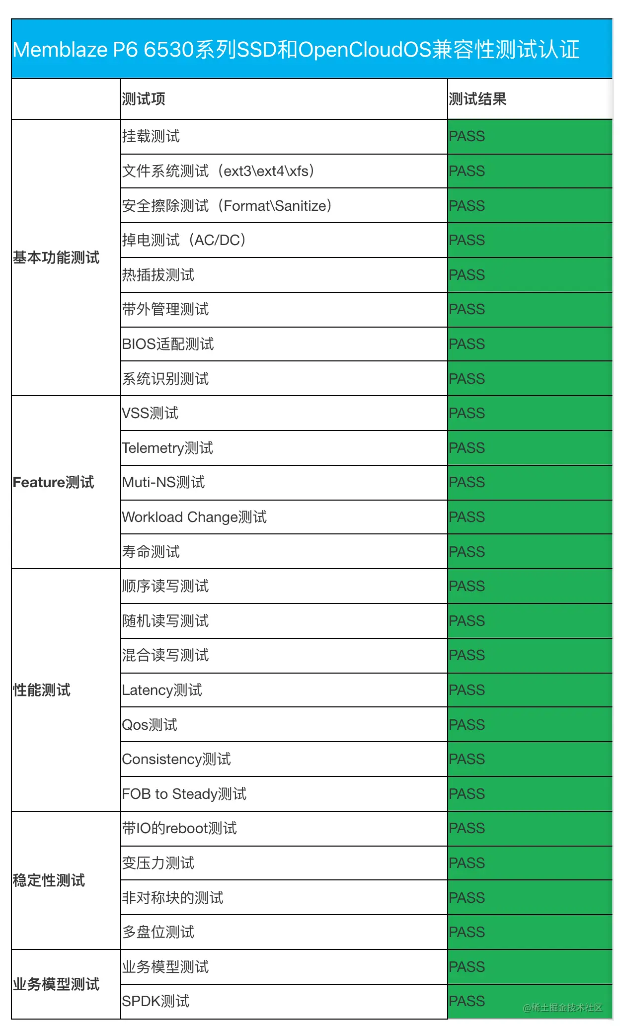 OpenCloudOS 的存储兼容性测试涵盖企业级 SSD 的系统识别测试(BIOS\BMC\系统内)、FW升降级测试、文件系统测试、各种功能测试验证;基本性能测试、多盘位性能测试、变压力下的非对称块的性能稳定性测试;以及热插拔、各种正常、异常掉电情况下盘的稳定性与大压力的长时间读写可靠性验证等工作。在整个测试过程中,PBlaze6 6530 始终表现良好,各项功能正常,性能发挥稳定,期间无任何错误发生。