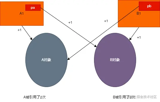 指针a和指针b是栈上的,当退出他们的作用域后,引用计数会-1,但是其计数器数是2,所以还不为0,也就是不能被释放。你不释放我,我也不释放你,咱两耗着呗。