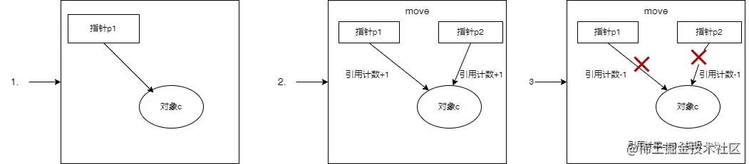 此时的拷贝构造函数使用了浅拷贝对成员对象进行赋值,且只有在引用计数为0的情况下才会进行资源释放。