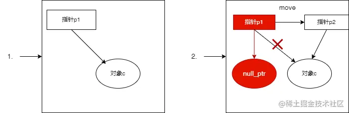 源对象资源的控制权全部交给目标对象。注意这里说的是控制权,即使用一个新的指针对象去指向这个对象,然后将原对象的指针置为nullptr